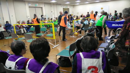 令和1年11月26日(火)目黒区田道ふれあい館2Fにて、目黒区老人クラブ連合会主催の「第3回手のひら健康バレー競技会」が開催されました。大会を重ねるごとにチーム数が増え、今年度は17チームの参加がありました。